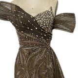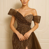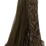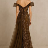 Une robe chic, tissée et ornée de plusieurs détails , fente à l’avant , bustier à fermeture avec manches maxi , robe avec traine et drapé en tulle de côté , parfaite pour une soirée chic et glamour, mariage.