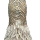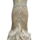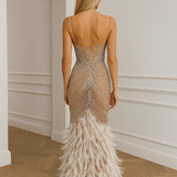 Une robe longue dorée majestueuse avec traîne, strass et plumes, parfaite pour en robe de mariée soirée et pour des événements importants.